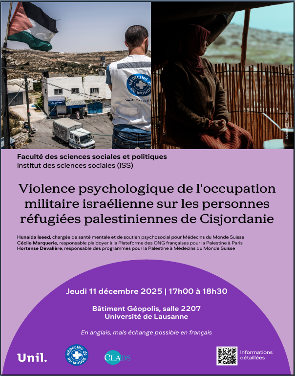 - Violence psychologique de l’occupation militaire israélienne sur les personnes réfugiées palestiniennes de Cisjordanie11 Décembre 2025 – 17:00 Géopolis 2207 Présentation et discussion du dernier Rapport de Médecins du Monde, organisé par Francesco Panese, Antoine Kernen